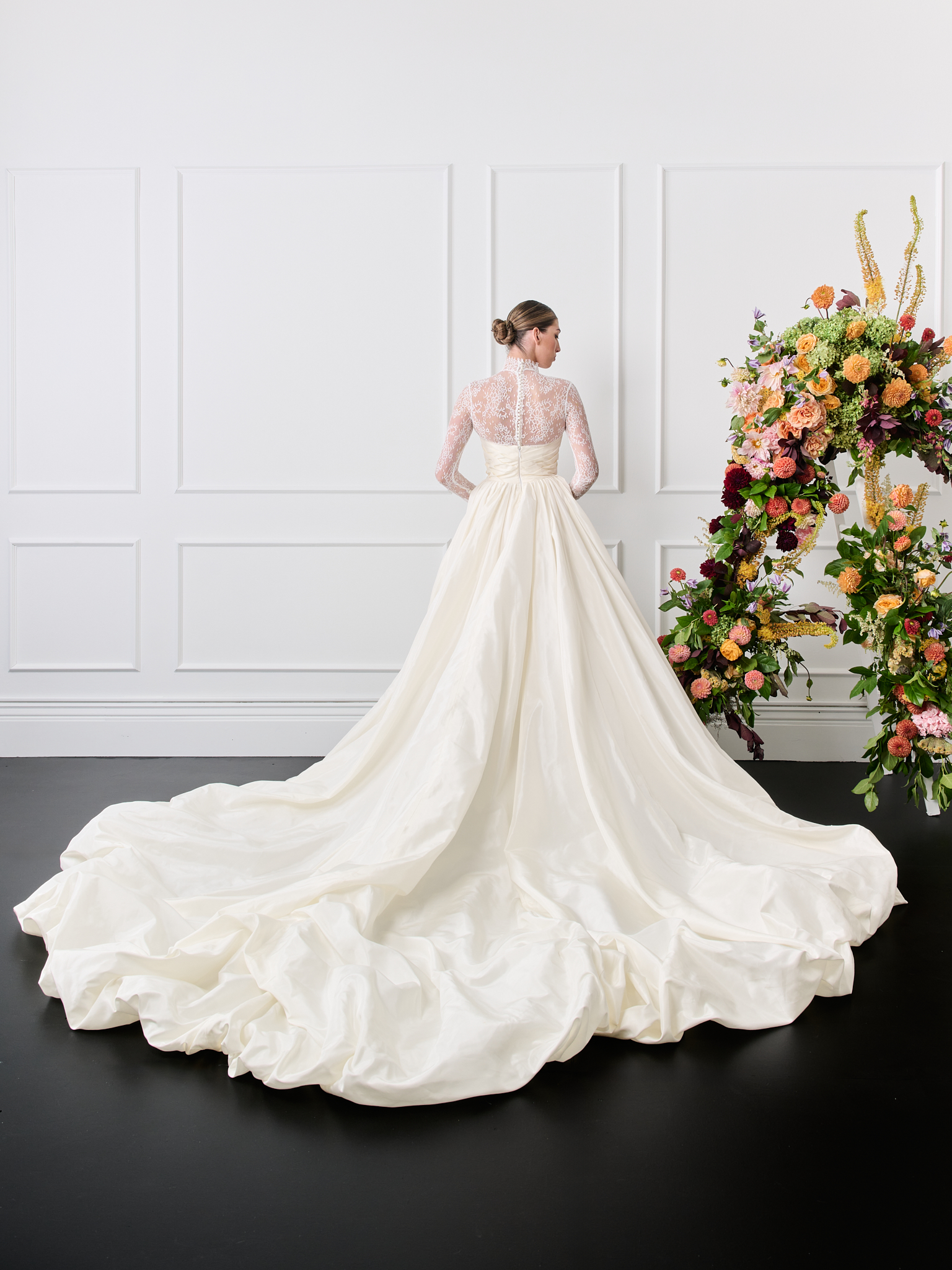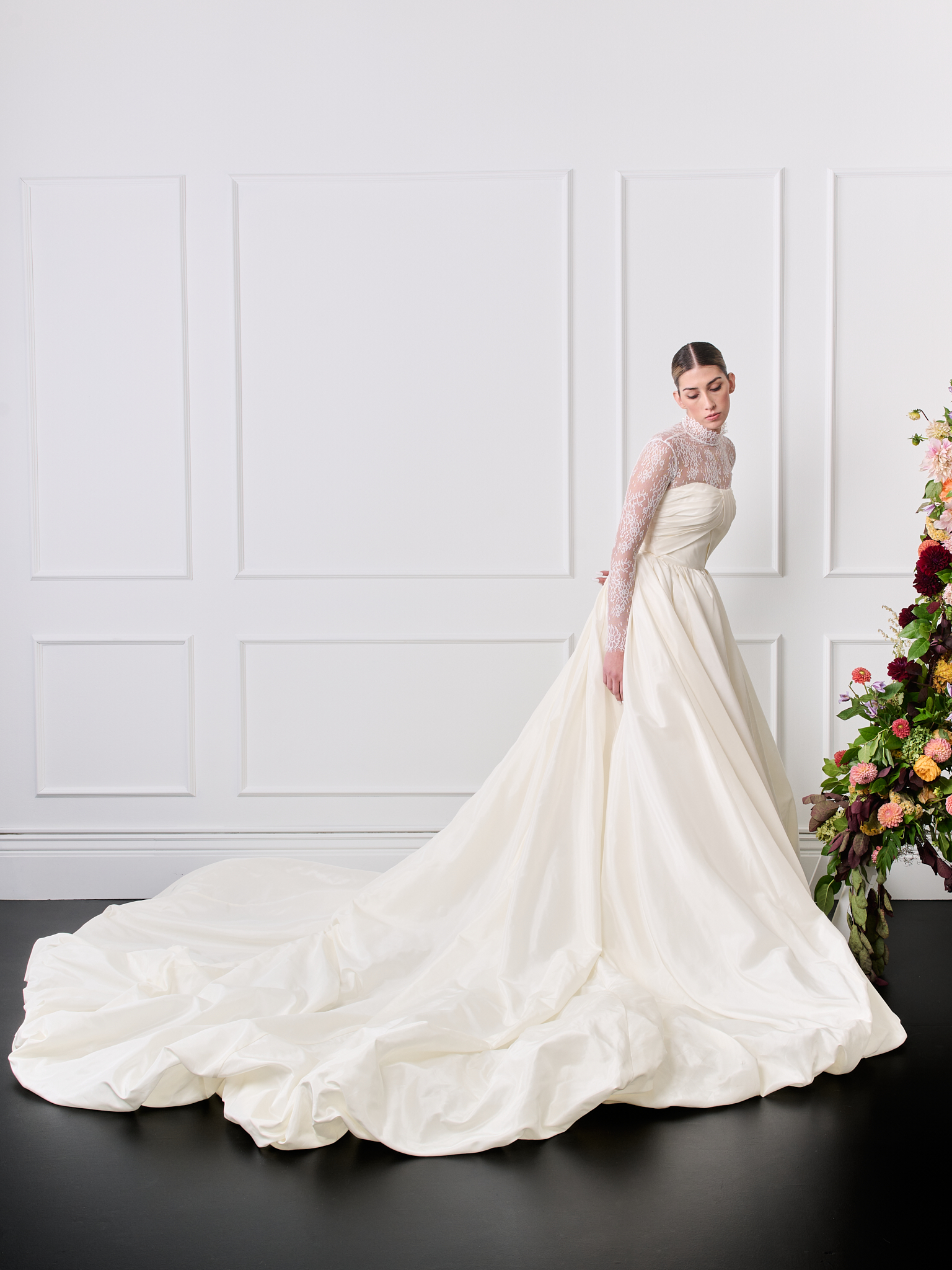 Details like the lightly gathered waist and signature couture tailoring elevate the gown, offering the perfect balance of elegance and structure. Ideal for brides seeking a minimalist look with maximum impact—this gown is a statement of pure sophistication.