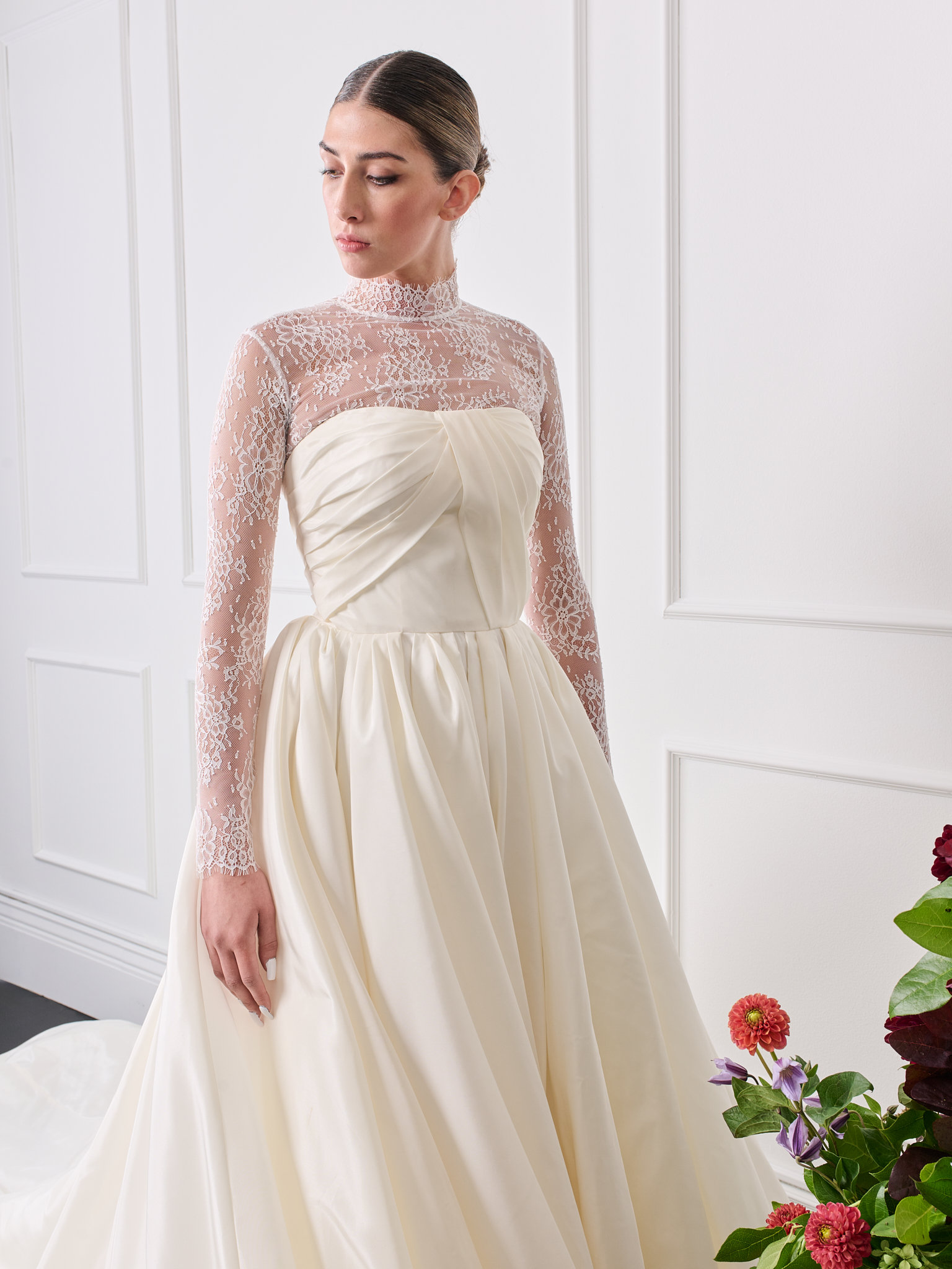 Experience the essence of modern American glamour in this exquisite Bubble hem wedding dress by Guillermo Pharis Bridal. Updated 2026 version, Crafted from luxurious taffeta fabric, this gown features a structured bodice with delicate pleating and romantic long sleeves that add a regal touch. The sculpted neckline flows effortlessly into a voluminous pleated skirt with a bubble hem, creating a silhouette that feels both timeless and dramatic.