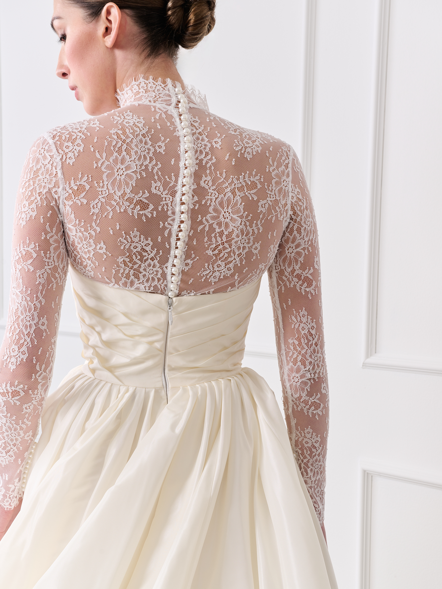 A taffeta fairytale gown with a smooth finishing, not easy to wrinkle, ethereal feeling. Gathered waist, pleated bodice. The bubble hem. 98 Inch train.